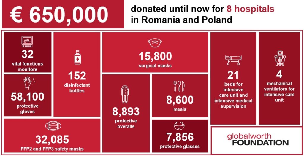 Now more than ever, we count on our donors to continue the global fight against the pandemic. As part of ongoing efforts to support communities amid the unprecedented impact of COVID-19, Globalworth Foundation continues to equip intensive care unites for COVID patients and to donate vital supplies for 10 hospitals in Romania and Poland: